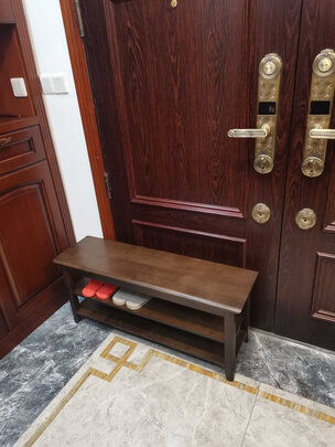 鞋柜颜色淡雅,木料坚实,坐垫是布料的很舒适。性价比挺高的!