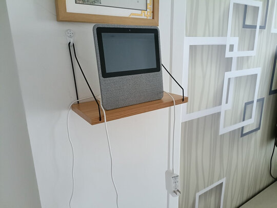 外观颜色百搭,适合简约风格,安装起来也方便,装在背景墙上,可以摆放物件也可以做装饰。放了一个小度音乐盒在上面,孩子可以听故事古诗啥的。用时避免了宝宝触摸。