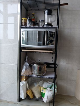 物流很快,马上就送到了。送了螺丝钉和工具,拼装过程很简单,我和女朋友两个人装的,一个人装应该也没有问题。货架是网格样子,放微波炉没有问题,但压强太大还是容易弄破。