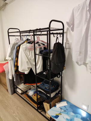 拿回来的时候我都特别惊讶了,没想到这么便宜可以买到这么好这么便宜这么坚固的架子了,回来里面有送六角的安装工具,安装很简单,挂了很多衣服,很结实也没有晃动,白色的颜色很简单,和家里的风格也好搭配,总之是很值得买的收纳神器了