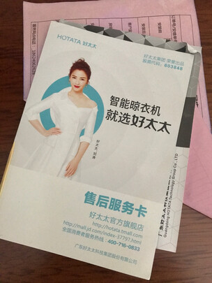 家人指定购买好太太品牌的晾衣架,这次选择在京东下单的原因是相比其他电商渠道京东优惠后的价格要低20元左右,而且京东提供免费的上门安装服务。下单后货物是厂家从广东发货,下单后第一时间京东安装服务就电话过来告之如何预约上面安装,还用短信做了额外的提醒,非常优秀的服务体验。厂家用的德邦快递,到货速度中规中矩,厂家发货时包装保护到位配件齐全。发货后预约了第二天的上门安装服务。第二天安装师傅准时到达,据其介绍他们负责京东晾衣架,厨卫水具等产品的安装服务,师傅带的装备很齐全,梯子,电钻都很专业,师傅很快就安装完毕,打孔灰尘处理的很干净,安装后还安装服务要求提供了保修卡和使用指导。整体而言,是一次非常不错的购物体验,京东的上门安装服务非常优秀,值得推荐和表扬!!!