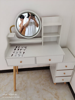 第一次在网上买家具,这个梳妆台是我要的不是很大的那种,这个化妆镜是可以调光度的,有三个调,柜柜也很扎实,就是拿回来的时间有点难拼,嘿嘿嘿,而且那个椅子也很漂亮,八错八错