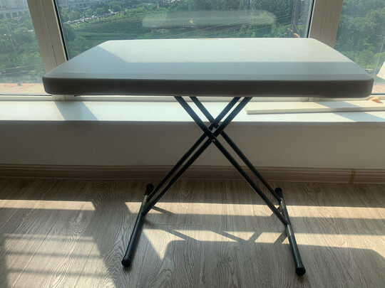 桌面塑料比较厚实,杏色,高度可调节还是比较实用的,整体属于做工精细那种桌子。轻巧便携。