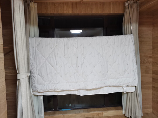 挂在窗帘杆上,晾被子很方便,不用的时候可以收起来,不影响空间