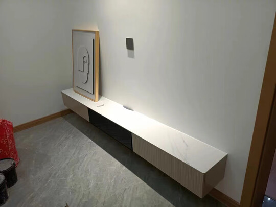 整体不错哦,中间的是岩板,两边的是全漆,拼接组合的,不是固定的,手一推就可以变动,就是岩板不是免钉胶固定的,是用的四个指甲盖大小的防滑垫垫在下面在,