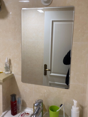 包装结实不易碎。镜子本身很精致,照人没色差和变形。;粘瓷砖上,安装下来:送的海绵胶不行,不能很好粘住瓷砖,必须借助免钉胶的力量才能粘牢。免钉胶表面干的快,时间短才能保持粘住效果。镜子底下垫了纸箱支持住镜子,用椅背靠住,2天后拿开,粘得很牢。;其实,瓷砖、涂料墙面,一管玻璃胶就可能粘得很牢。;满意!