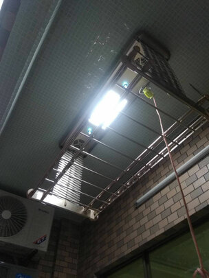 到货非常快,包装完整,安装师傅也非常负责,我是第二次购买晾衣架,上一次的师傅用的气钉*安装的,很不结实,这个师傅用的膨胀螺丝,,,,承重很好,;产品与宣传非常相符,唯独一点缺点:风扇风力太小,可以说是无风感,,,,,无语。;还有就是切割点有瑕疵,可以看图,,,;总体还算可以,好评。