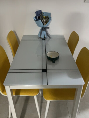 哇塞,添上这套桌子,瞬间有了家的感觉,大小合适,颜值很高,关键是价格不要太划算啊,虽然是玻璃表面,但是看上去好精致的,简单而不简约,是我们喜欢的风格,椅子配色也是绝绝子,时尚靓丽,改天再买几副画...