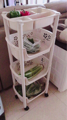 这个蔬菜架子。容量很大。挺结实的。蔬菜放在上面。很方便。而且每一层之间都镂空有花纹,比较透气。都挺好的。价格也不算贵。而且底下还有四个轮子,可以随便拖动。