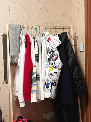 这个衣架是原木的原木色的,质量的话比较好,但是需要自己手动的拼装,拼装出来的话可以放很多东西,质量也不错,旁边还有两个专门挂东西你的小按钮摸上去是原木的,但是不知道是什么木头,感觉质量还挺好的,价格也不贵几十块钱。