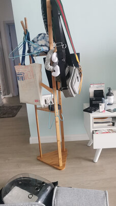 外观样式:纯木颜色,放在客厅里非常好,很百搭。;商品质量:质量也很好,三角稳定结构,挂很多东西都没什么问题,安装也很简单,螺丝固定,简单容易上手。;产品材质:是木头的,没什么异味,很好。;承重能力:承重能力很好,挂那么多包也没问题,挂一个风衣也可以撑得住。;适合场景:放在客厅玄关的地方,省地方,还方便,可以说非常优秀了。