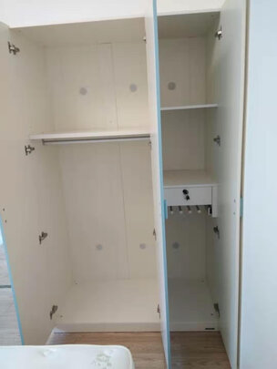 柜子已经安装快俩月了,才发现没有评论。;大热天两位师傅辛苦了,效率很高,不一会儿就安装好了,还调试门和抽屉的闭合程度,很细心?;618活动买的,价格确实便宜。有一说一,柜子还是有些味道的,拿风扇吹,放竹炭包,散味后淡了一些;空间布局感觉如果左边做成上下两档,都是挂衣服的,右边全做成4-5个格挡,这样应该利用率更高