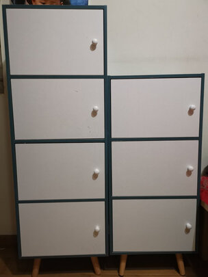 总体不错。;小问题是三层柜背板是绿色,四层柜背板是白色。;不足是不能调整门的左开和右开,广告是左右开图片都有。本来组合柜计划一个左开一个右开的。建议隔板上左右开两个门轴孔,这样用户可以在安装时可以自己选择左开还是右开。
