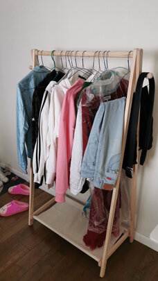 商品质量:质量很好,没毛病,摸着表面很光滑,没有毛糙挺不错的;配送服务:物流很快昨天买的今天到的;产品材质:没有其他味道,单纯的木头味挺不错的;承重能力:还没挂衣服,不过我就买来就是挂春天的一些衣服!666