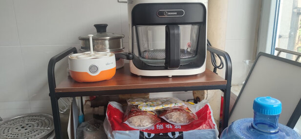 置物架和图片一样,质量不错,挺结实的,也很好安装,按照说明书很快就能组装起来。我家下面放了一个小烤箱,还有很大空间,上面是空气炸锅,还能放两个小的物件。
