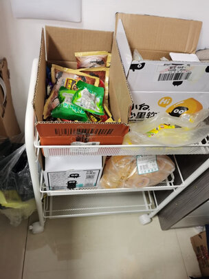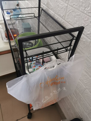 包装完好,送货速度超快,一开始收到货还有点担心,怕装不好,哪知道拆开几分钟就装好了,非常简单,连螺丝刀都不要,放在客厅装一些小零食之类的,非常适合,下面的可移动滑轮也非常方便,侧边还有一排挂钩,总之非常满意。
