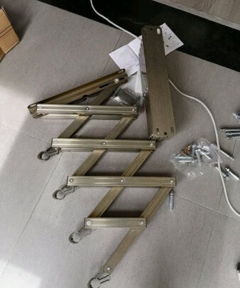 快递小哥真不给力,丢在小区外超市门口,万一丢了他陪吗,伸缩衣架很漂亮黄色的大气,凉的衣服也不怕被风吹走,也不怕外面一根够不到,方便,安装师傅我一个电话马上就来安装了,我家栏杆太细只够订一条螺丝,安装师傅就给我多订了几个螺丝加强稳固,大赞,后来才发现我家阳台上升降衣架也是他装的,有缘。