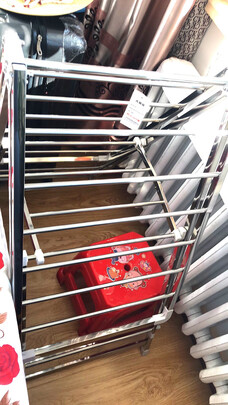 价格感觉很优惠。目前来看,是不锈钢。多好的看不出来。晾被子很方便,而且两个都可以同时晾。晾衣服必须用那个卡扣。要不然会走。卡扣塑料的,估计以后要换,肯定比架子的寿命要短。总体来说性价比算高的。能用三年也就值了。