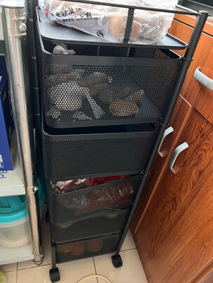 外观样式:还行。;商品质量:没我想象中好,宜家同等价位的架子比这有质感,只是没有轮子。将就用吧,也不会容易坏。;配送服务:京东配送很给力,第二天就到货了。;产品材质:我本以为很重,结果很轻。;承重能力:放厨房放点蔬菜水果什么的没问题