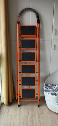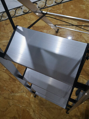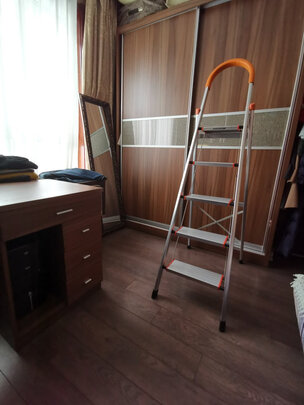收到梯子了,包装很好,内部有塑封膜包装,外部有包装纸箱,铝合金材质很漂亮!五步梯还是蛮高的,我踩在四步位置,棚面及柜上的东西都能够着!我家棚面2.8米,有需要的正常买四步梯就可以,正常家里都够用!物流不错!