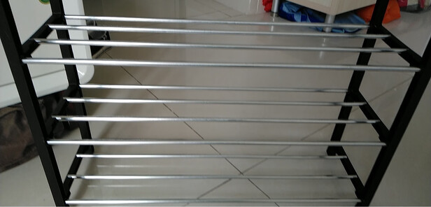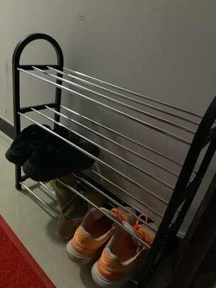 鞋架不错,发货很速度,物流很给力,给快递小哥比个心!鞋架边上的黑色框架是软的,分量不重,安装起来很简单!三层的放的鞋子也不少,刚好可以放在卫生间!占的地方少!太喜欢了!黑色的鞋架,简单大方,百搭款!推荐推荐!