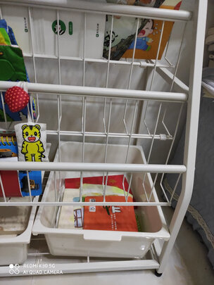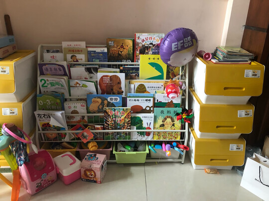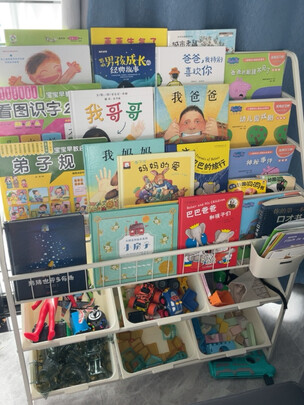说实话这个书架我真的纠结了好久好久,看了很多不同材质的,本来之前想买塑料的因素比较可爱,后来觉得还是这样的架子不占地方而且收纳量大,直观,方便孩子自己拿。