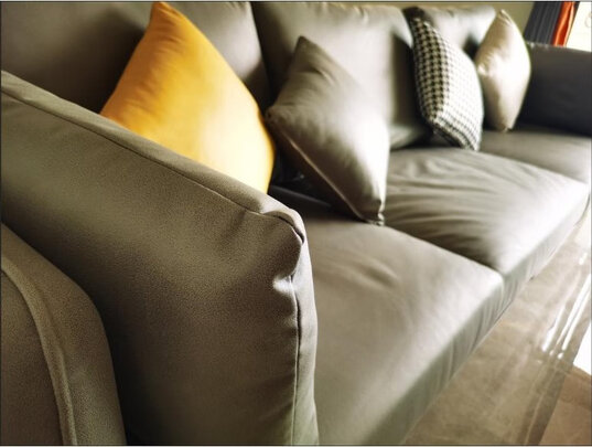 沙发材质很厚实,坐着也很舒服,性价比很高,尺寸大小刚刚好,摆在客厅很时尚没味道