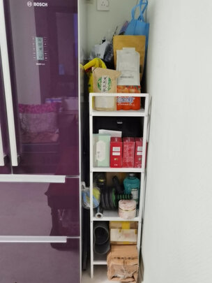 安装方便,很实用,稍微单薄了一点有点晃悠,但放东西承重还是可以的,对的起这个价格。我家是冰箱边上有一小块空间,正好纵向放下,挺能塞东西。