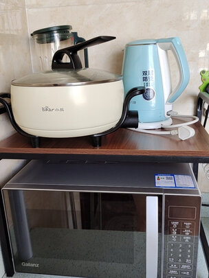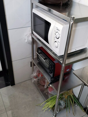 这个微波炉架子很好用 这个价格完全值得 质量还不错 上面的板层是实木的 可以放其他厨房用具 还送了几个小挂钩 东西很喜欢