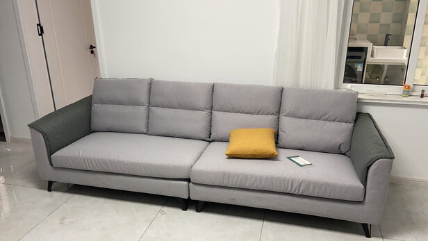 质量很好很结实没有什么异味,颜色比较耐脏。沙发软硬适中不容易变形,面料也很舒服比较柔软舒适。款式简单大气比较好搭配家具。
