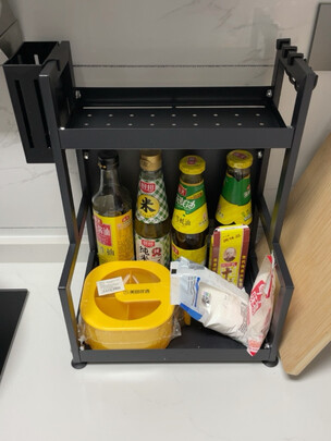 用了半个月了 收纳调料很方便 不锈钢材质 质量很好 管子很粗 足够撑起 两边还可以挂勺子 菜板 很实用 不占地方