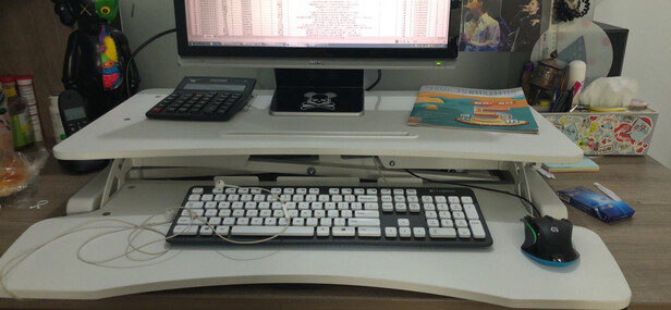 比想象中的要大好多,不过升降过程还可以,顺滑,没有卡位之类的情况出现,物品很重,所以比较稳,没什么毛病,就是大,幸好办公桌本来就很大一张,否则这升降台就没地方放了,不过还是会导致没地方可以写字或者吃饭,但总体还是不错的。