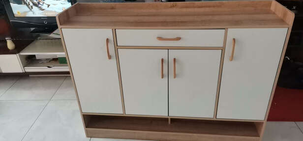 鞋柜款式非常简约。尺寸大小合适,摆放鞋子非常方便,做工细致,好评。