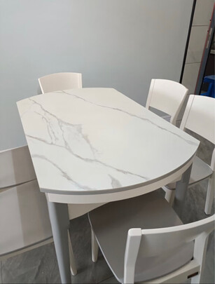 这款餐桌椅真的是太满意了,样式颜色都很好;看,是最近正流行的岩板材质的,桌子可方可;圆,尺寸刚好,平时四个人用正好,人多了还;可以打开成圆桌,坐上六七个人完全可以的。