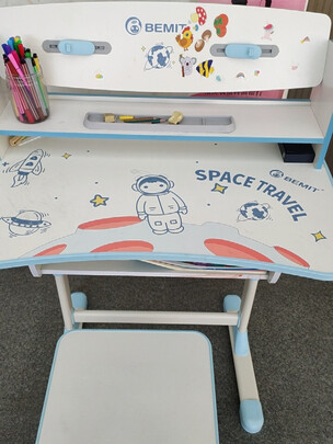 桌椅收到了,挺好的,质量不错,也没有什么味道。底妆也很容易两三天就到家了,打开一看颜色很正,质量也很好,卖家发了组装图。很快都装好了,宝贝很开心,安装好后发现桌子颜色非常大气和美观。这款书桌。设计的非常好。节约空间。学习桌颜值很高,五星好评。