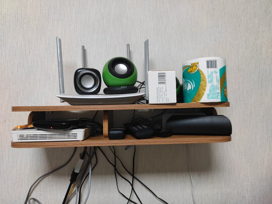 怎么说呢,商品的重量还是有的,只是心里总感觉钉在墙上不太牢固,总的说来有了它,的确对于收纳放置电视盒子、光猫、路由器、遥控器都还是比较有用,不像以前放着到电视柜上感觉乱糟糟的。