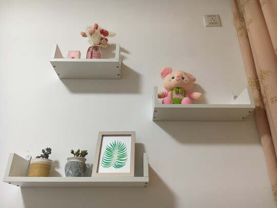 外观样式:挺好看的 白色百搭;商品质量:还可以 就是不知道无痕钉的结不结实 不敢放太重的东西 就当个装饰吧;配送服务:京东物流配送一直好评!;产品材质:挺厚实的;承重能力:目前没放重的东西 如果放重东西了不知道会不会掉 毕竟不是打孔的 是无痕钉的 但是打孔的方便