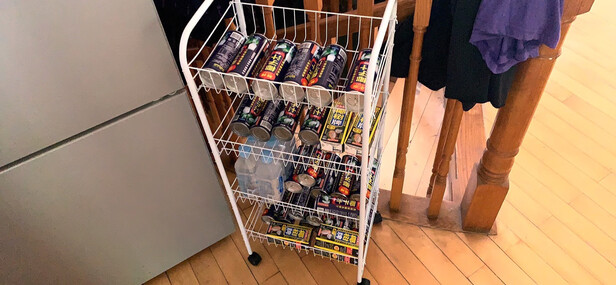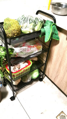 这个置物架太实用了,我自己就把它轻松安装完成。四个小轮装好,立起来,打开,顶层挡板翻过来,完工。有小轮的置物架太方便了!可以推着来回走。很方便容量又大放了很多厨具在上面,厨房看上去整洁多了。