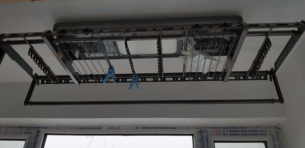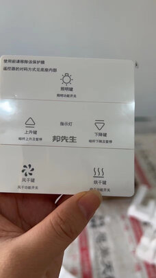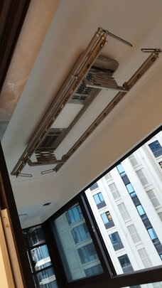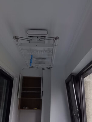 晾衣架终于收到,快递速度无言,1日一直推迟到5日才收到,等安装好己经6日,摇控上风干功能感觉不是十分强大,与烘干有区别。两位年轻的安装师傅非常好,还帮我把阳台灯安装到另一位置。