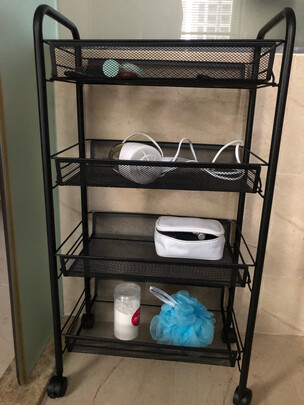 配送服务:非常好;商品质量:质量不错;外观样式:黑色的,非常酷;产品材质:铁质;承重能力:放在卫生间使用,塑料轱辘