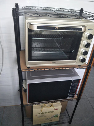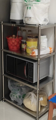 架子收到了,自己安装,可以放微波炉、烤箱、以及一些杂物,收纳功能很强大,节省了很大的地方。