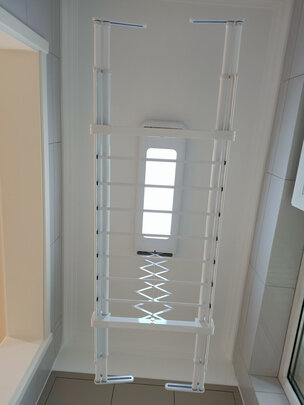 阳台很小,用这款小巧玲珑的很合适,两侧可伸缩,伸开前不挡吊柜门的开合,伸开后刚好充分利用空间顶部设计很棒,晾晒枕头可以很方便,喜欢