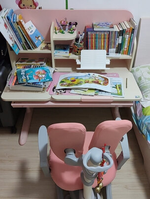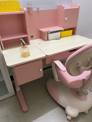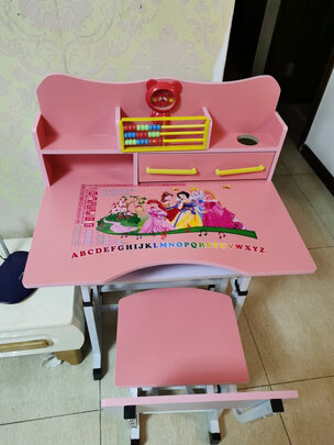 本次购物书桌是一次最满意,我小孩很喜欢,坐着正合适舒服,粉色桌面很温馨,桌面还有美丽的图案很好看,她很喜欢,装饰品钟表更美观。书桌可以调整高低,以后还可以继续调高使用。; 安装过程中由于自己不熟悉怎么安装反了两个小木板,还以为商家发错货了呢。客服很热情耐心的解释,指出哪里安装错误导致的,重新安装完成后感觉十分完美!