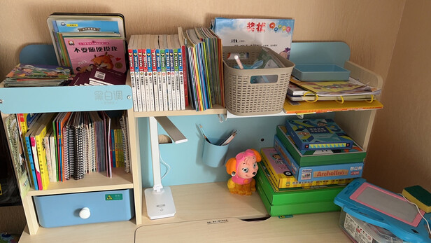 各种推荐文看了很多,网上又对比了几家,最终选定了黑白调,外形漂亮,书架布置合理,颜色粉粉的是宝宝自己选的,挺好看的。凳子可以调节高度和前后距离,桌子也可以调节高度,大人用也可以。桌子一点味道都没有,看着也比较结实,很惊喜。