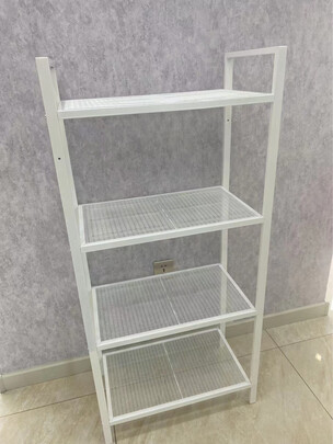 这款置物架非常漂亮,性价比比较高,除了两个网眼掉了点漆,我用汽车用白漆补了一下,其他都不错,值得买。;外观样式:白色百搭很漂亮的。;商品质量:全金属的质量还行,有两个网眼掉了点漆。;配送服务:德邦快递速度还可以的。;产品材质:金属架子,材质还可以的。