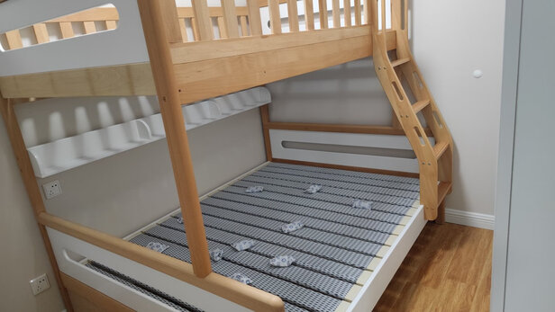 买的一米五的床,质量很好,木头和排骨都很结实,距地面高度合适,床下还能储物。样子也可爱,喜欢。强烈推荐!