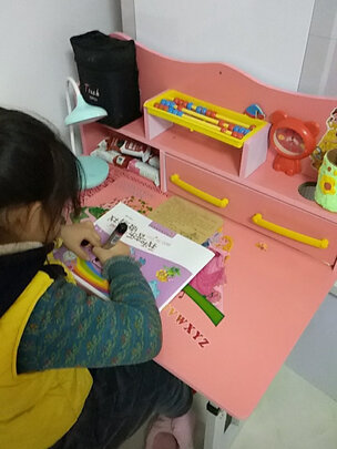 很可爱的一张书桌,孩子很喜欢,实物很好看,装好后稳定牢固,桌子也没有什么异味,桌椅高矮也好调节,真心满意