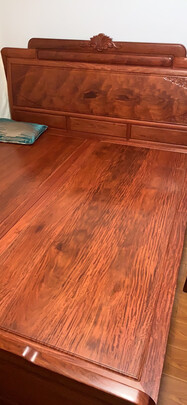 做工非常不错,大果紫檀的气味真的很浓厚。床板虎皮纹还是蛮多的,最喜欢就是床头独板板的鬼脸,很像人的一对眼睛,纹路也很飘逸。