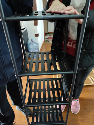物流快,包装完好,没想到居然这么沉,买来放在家里楼梯的防火门前。打开包装直接就可以成四层,安上轮子就能推着走了,可以随时打开或收起。黑色简洁大气,架子的承重能力强,放置很稳定,轮子推着顺溜省力,声音很小。,质量不错