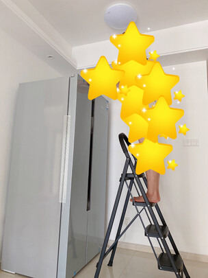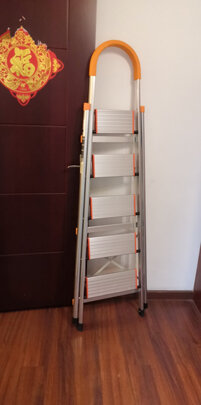 外形外观:外形很好看,如图。梯子很实用,很好收纳,用完直接靠墙放就好了,收放自如,一点都不占空间。买来已经用了好几次了,站在梯子刷墙很方便。上面的扶手很好,站着的时候握着圆弧状的东西很有安全感,感觉自己稳稳的。后来来装灯的师傅也说不错。